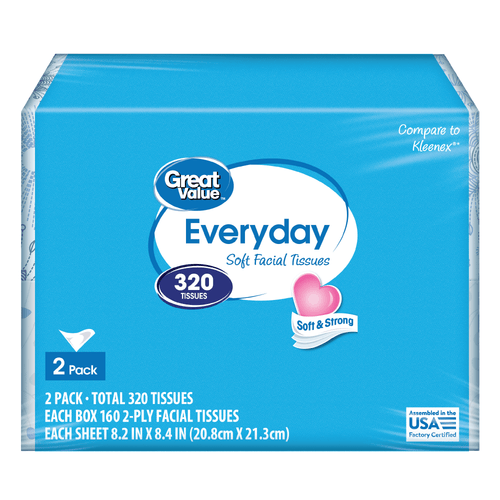 Great Value Everyday Soft Facial Tissues, 2 Flat Cartons, 160 Tissues per Flat, 2-Ply, Compare to Kleenex®